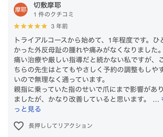トライアルコースから始めて、1年程度です。ひどかった外反母趾の腫れや痛みがなくなりました。痛い治療や厳しい指導だと続かない私ですが、こちらの先生はとてもやさしく予約の調整もしやすいので無理なく通っています。